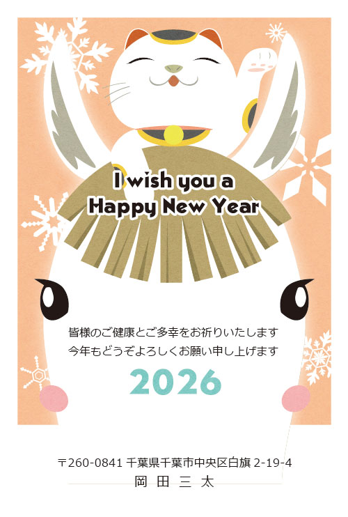 実は招き猫って、上げている手によって意味合いが変わるそうです。知る人ぞ知る、このマニアックさに惹かれる方にぜひお使いいただきたい年賀状デザインです。